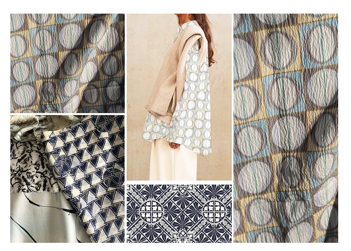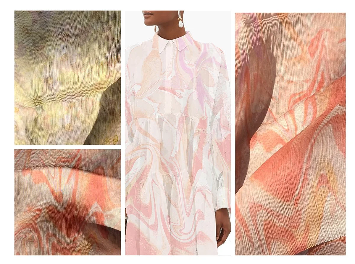 A textured silk crepe which has a slightly raised, seersucker like appearance. This fabric works well with simple designs and monotone colours, where the texture effect can easily be seen.
